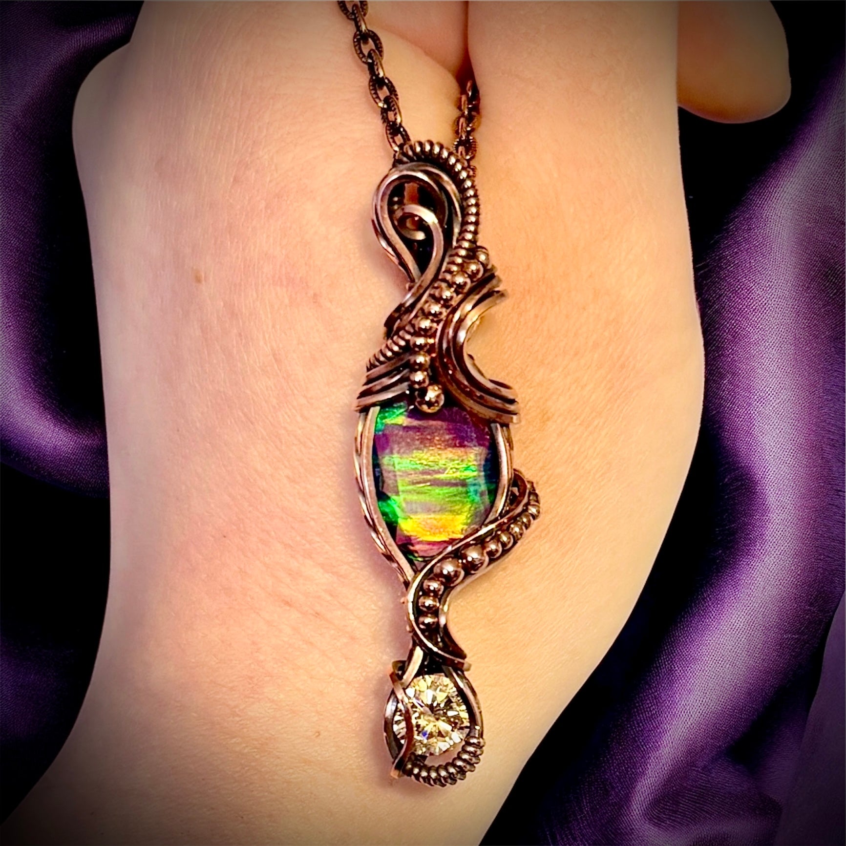 Beautiful faceted synthetic Aurora Opal and Quartz doublet wrapped in oxidized copper with a sparkly champagne CZ below.