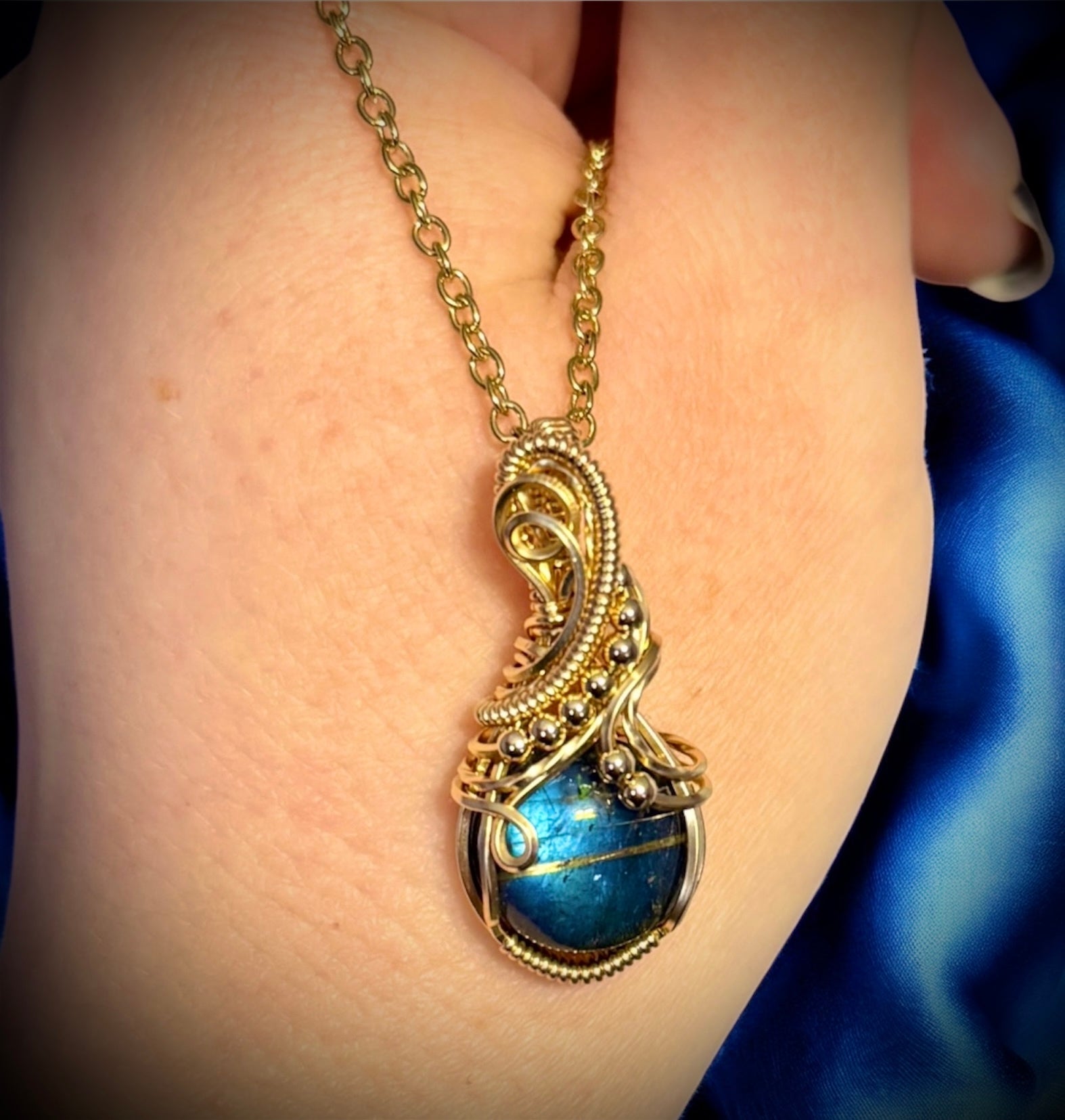 Such a pretty blue Labradorite mini with golden Rutilated Quartz doublet wrapped in 14k gold fill with 14 gold fill beads.