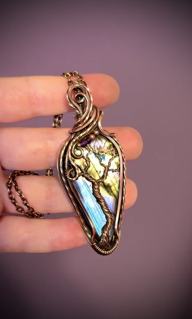 Beautiful purple/blue flash Labradorite wrapped in oxidized copper with a tree of life design. Copper and Amethyst beads complete this piece.