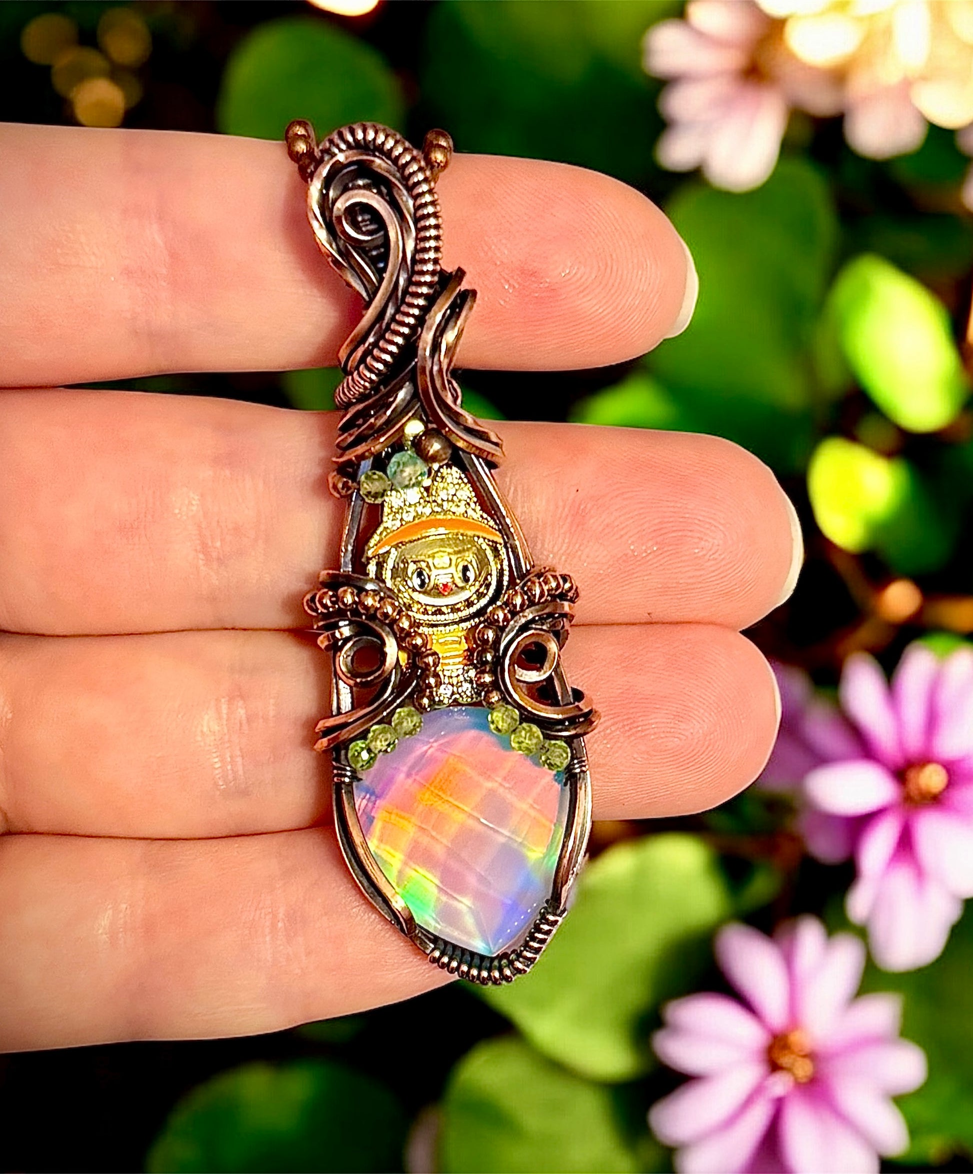 Cute Labubu charm wrapped in oxidized copper with a pretty faceted synthetic Aurora Opal below. Copper and Peridot beads add fun pops of color.