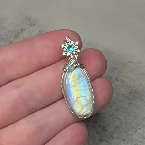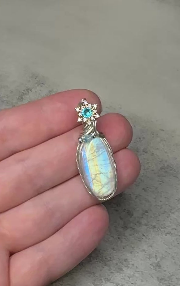 Beautiful flashy Rainbow Moonstone wrapped in solid sterling silver with a pretty CZ snowflake above. Sterling silver beads with a blue Topaz bead compete this piece.