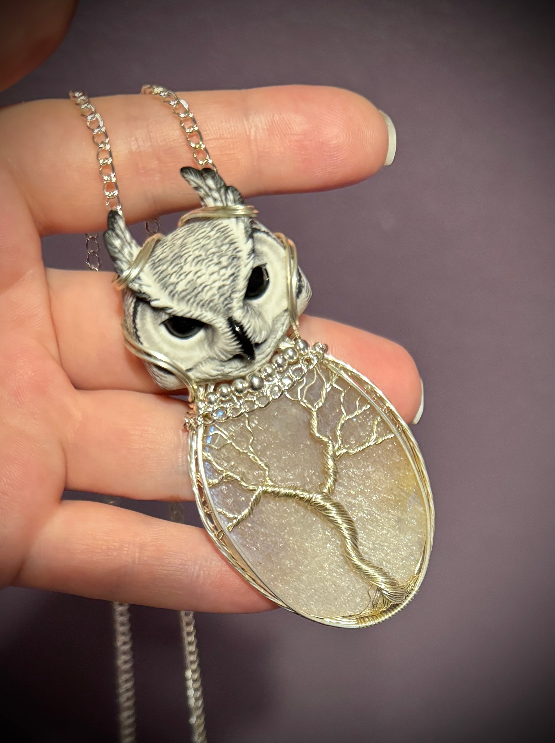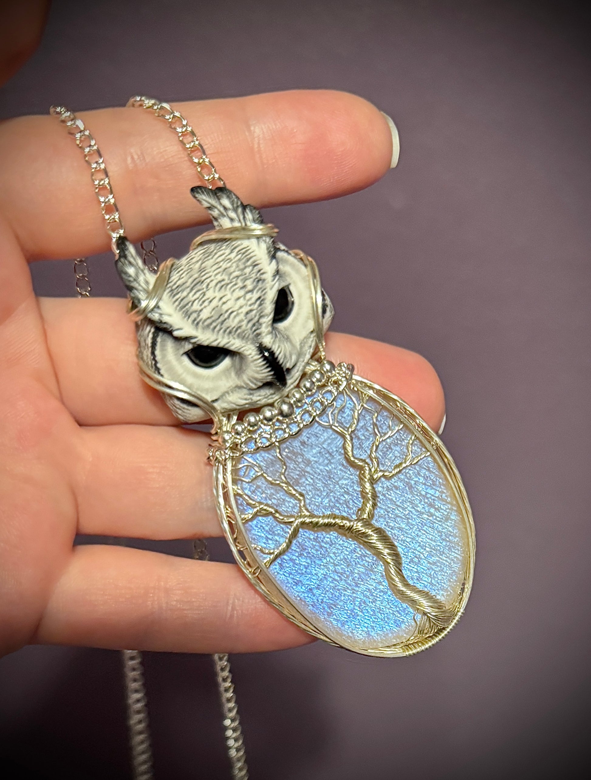 Gorgeous Belomorite Moonstone wrapped in solid sterling silver with a tree of life design and a super cute polymer clay Owl above. Comes with a 20” attached chain.