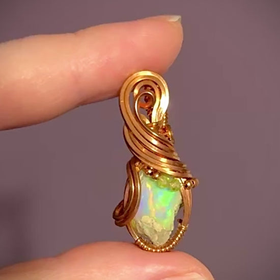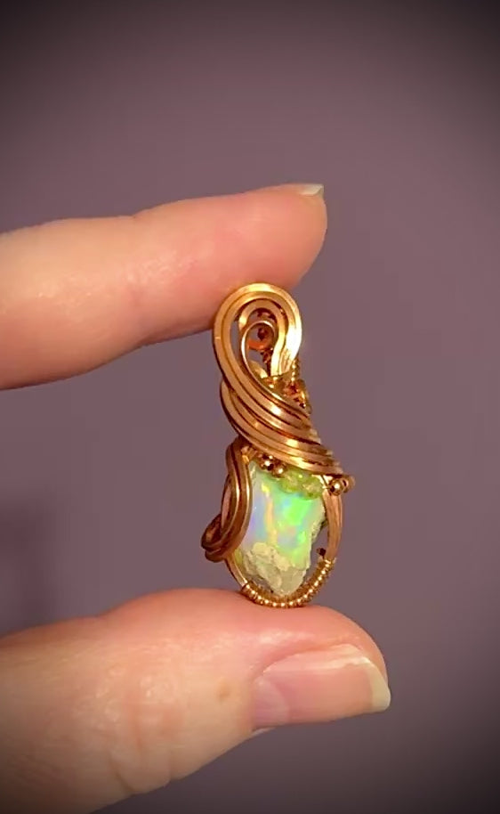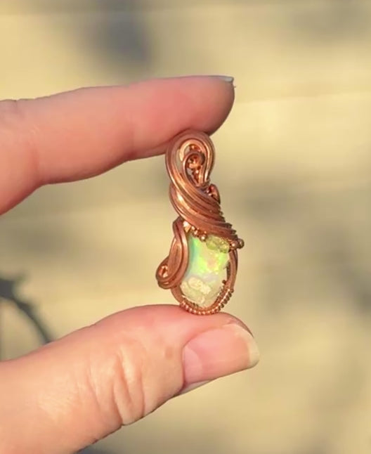 Gorgeous all natural flashy raw Opal with matrix wrapped in shiny copper. Copper and Peridot beads add a fun pop of color. So much more prettier in person!