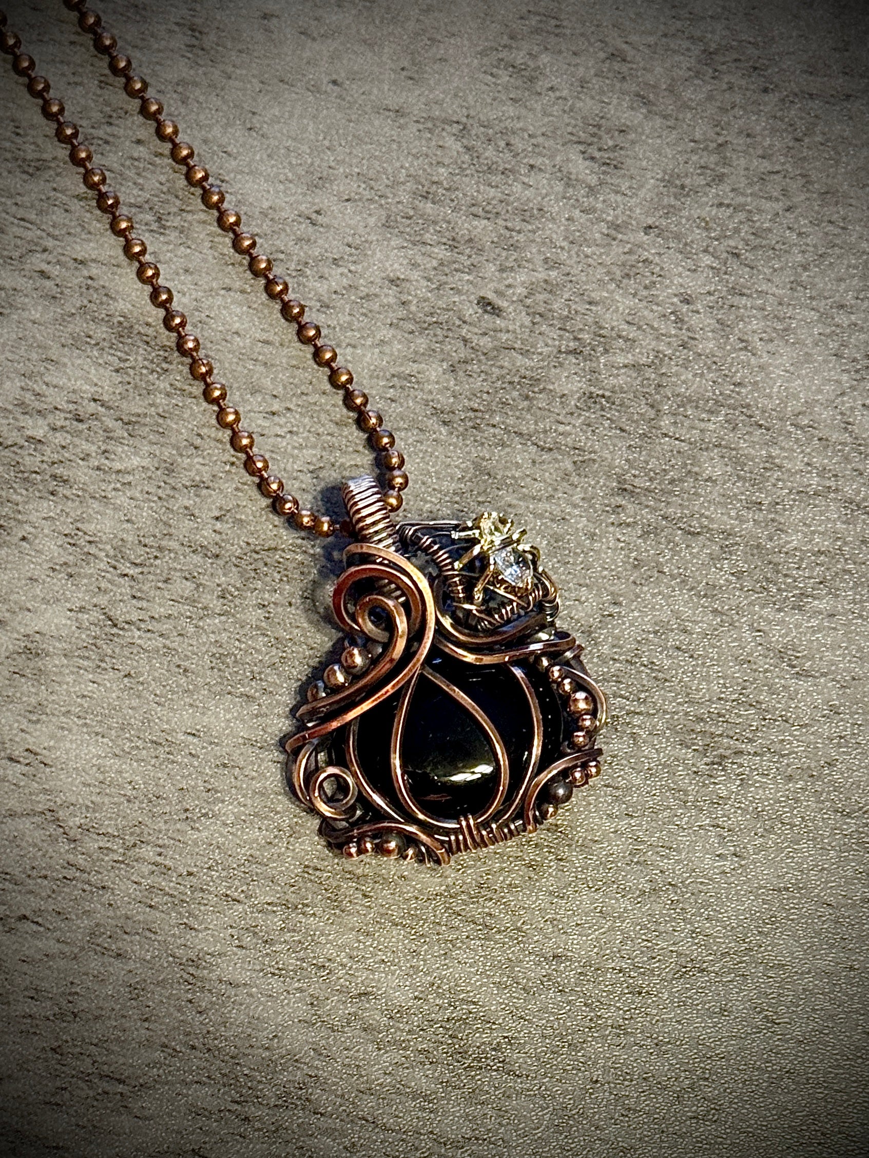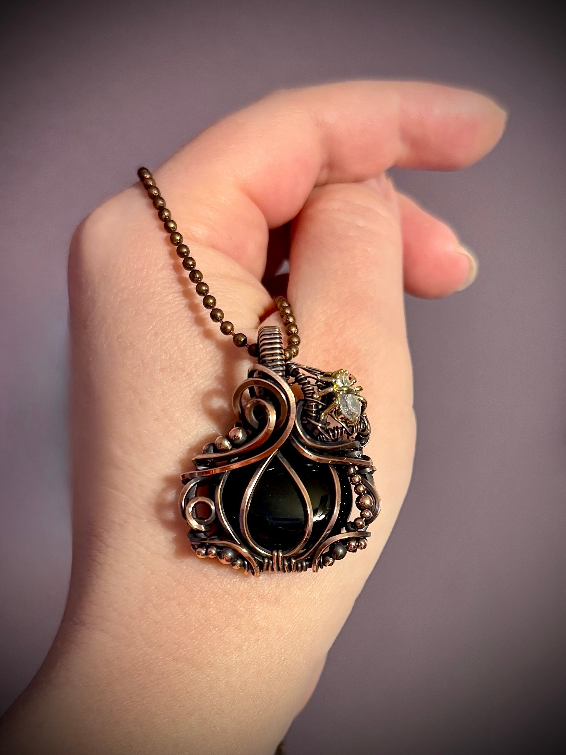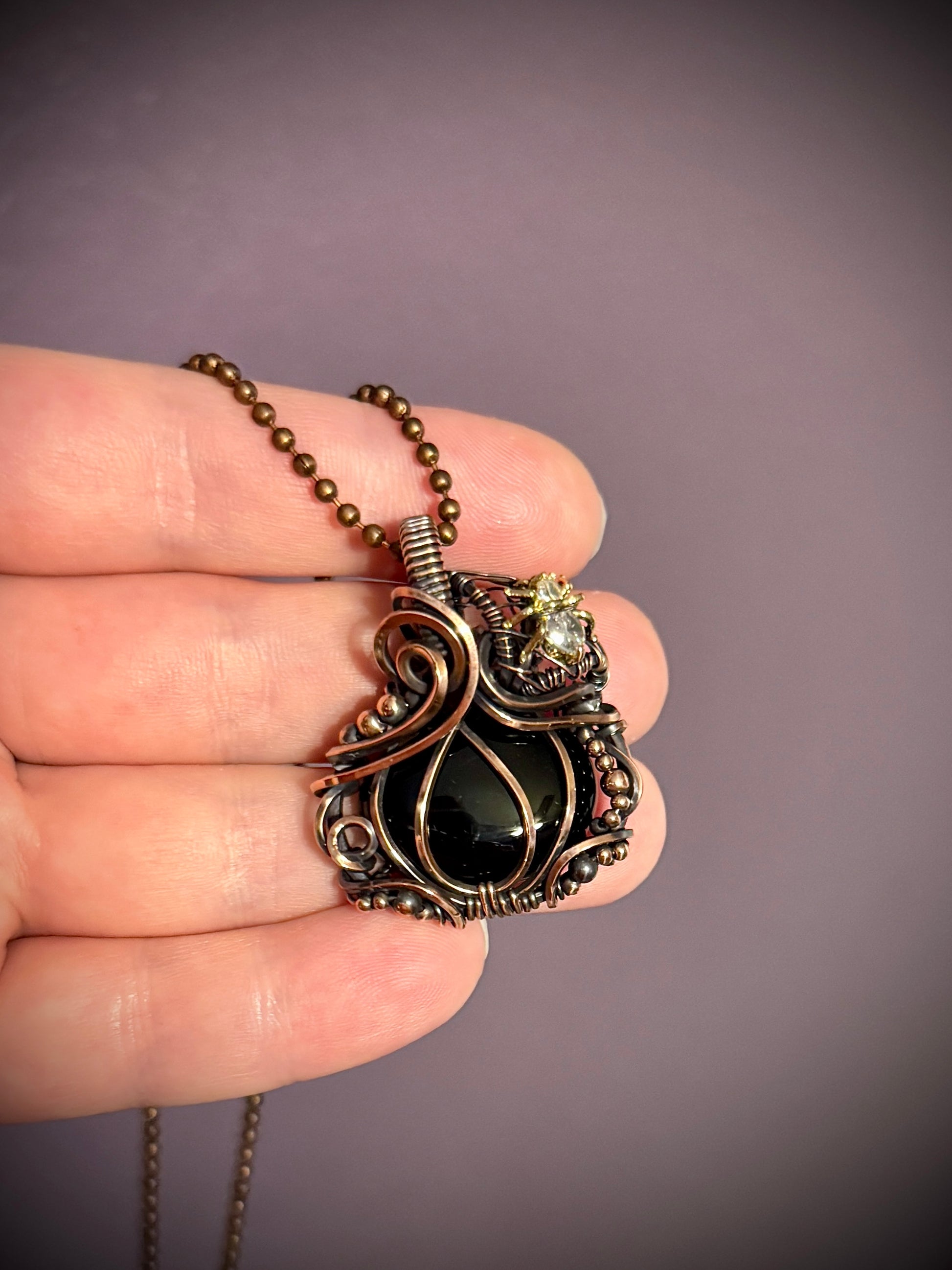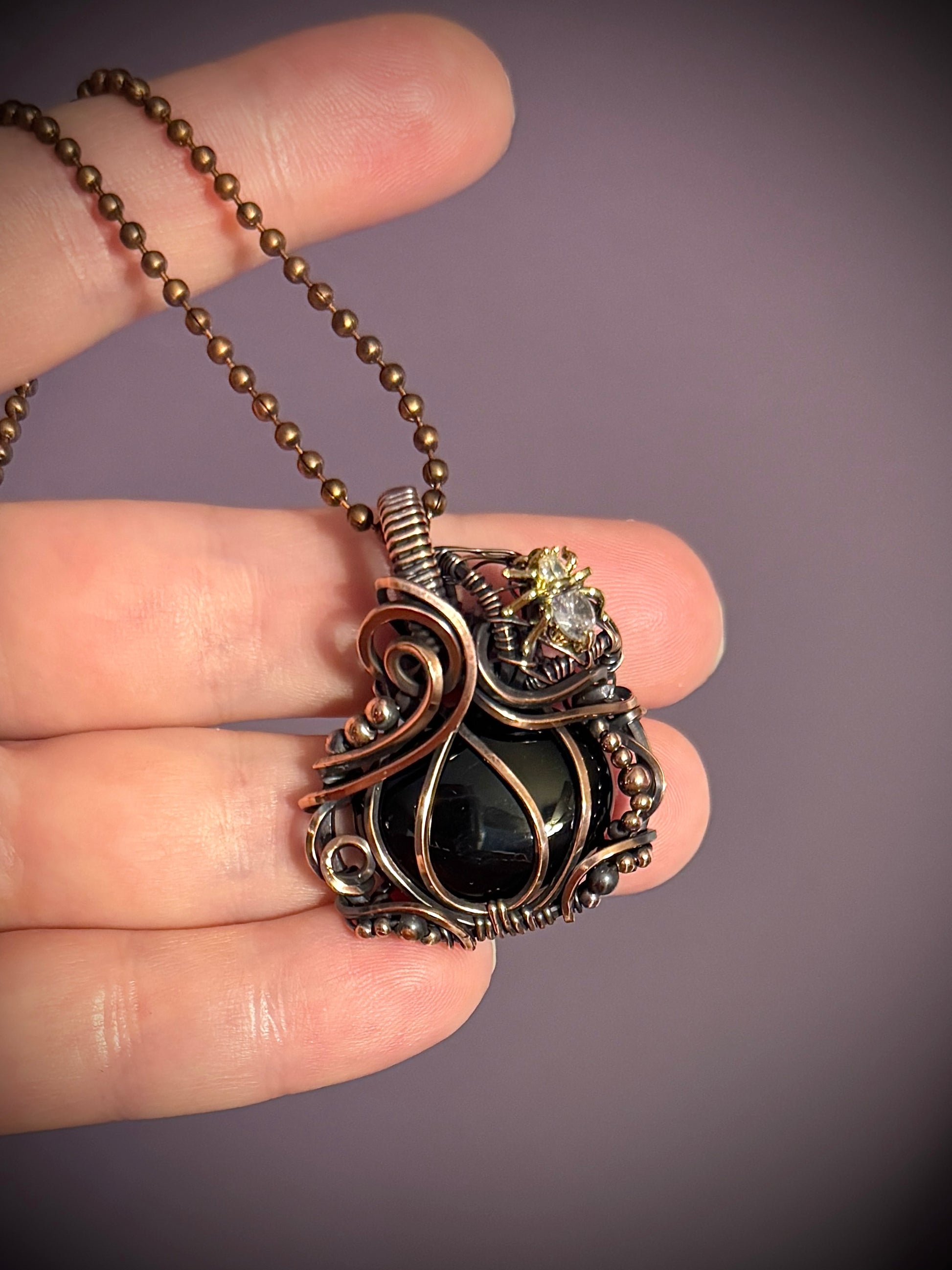 Pretty Black Onyx wrapped in oxidized copper in a pumpkin design with a gold fill CZ spider in a spider web.