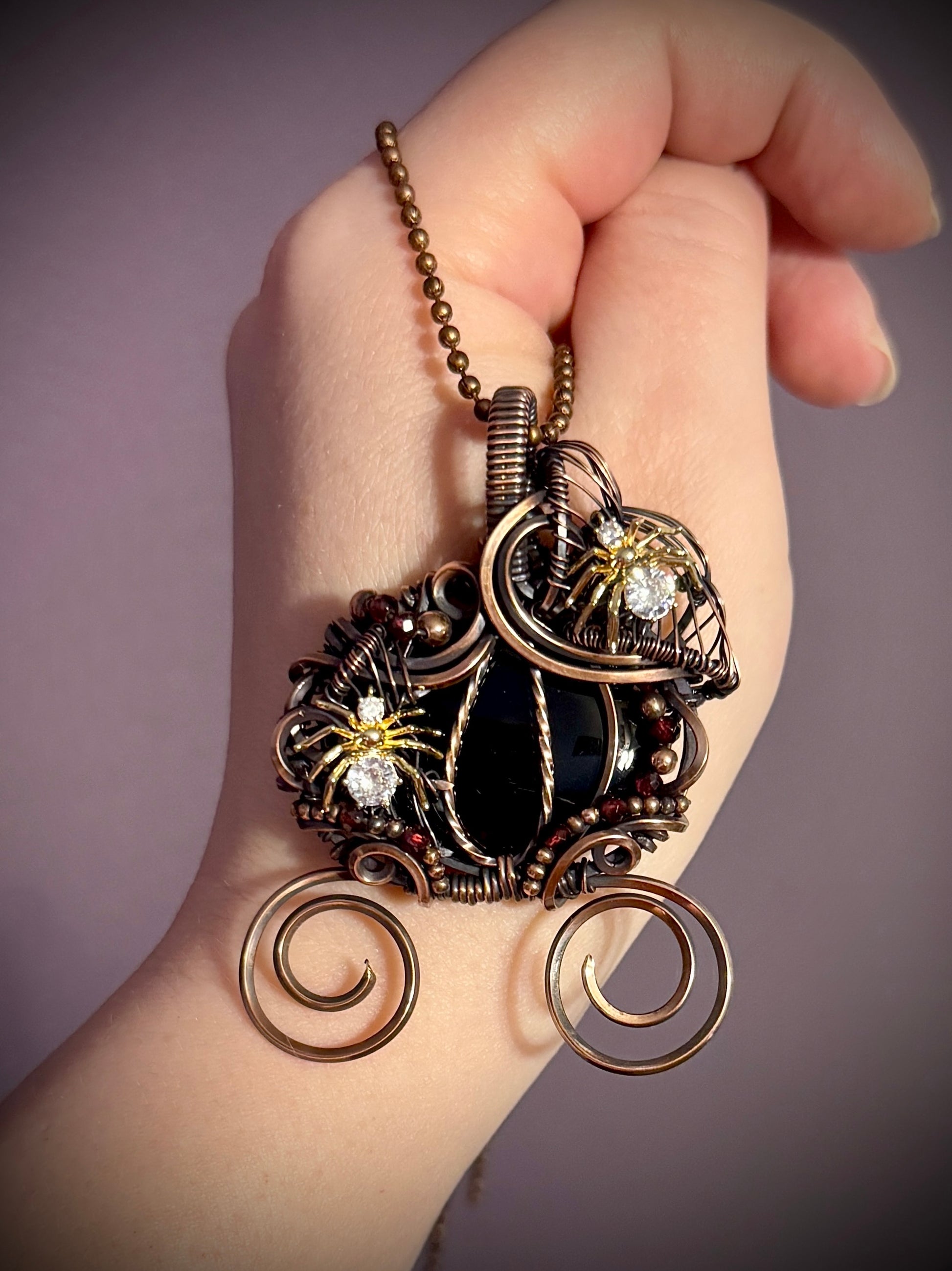 Pretty Black Onyx wrapped in oxidized copper in my signature pumpkin carriage design with gold fill CZ spiders in spider webs. Copper and Garnet beads are along the edges.