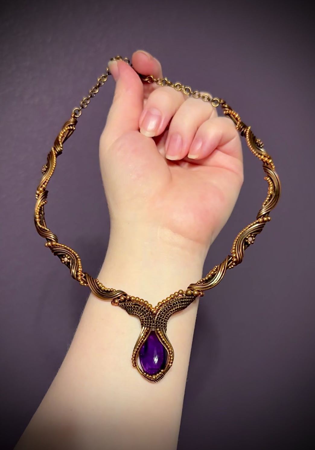 Gorgeous gemmy purple Amethyst wrapped in oxidized copper in a collar style necklace. Copper beads accent this piece along with Rhodochrosite beaded flowers. An adjustable chain is in the back.